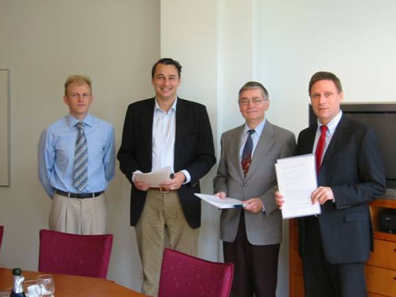 Fügen Nach der Vertragsunterzeichnung v.l.n.r.: Dipl.-Ing. Albert Waal (TU Hannover), Dr. Stephan Ludewig (STARWAVES GmbH), Prof. Dr.-Ing. Hans-Peter Kuchenbecker (TU Hannover), Andreas Fischer, NLM